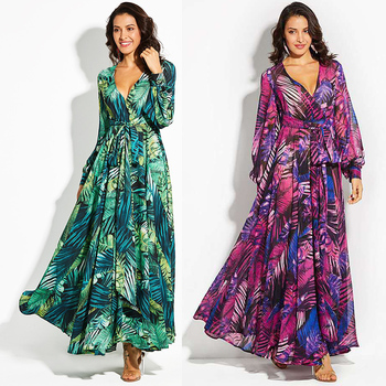 2022 महिलाओं पफ लंबी आस्तीन वि गर्दन पोशाक यूरोप पुष्प मुद्रित स्प्रिंग समर कारण ढीला एक लाइन प्लस आकार लेडी मैक्सी लंबी पोशाक