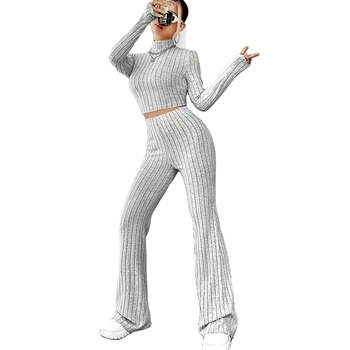 महिलाओं का नया फैशन कैनिट 2-टुकड़ा सेट ठोस रंग स्टैंड कॉलर लंबी आस्तीन वसंत शरद ऋतु के दैनिक उपयोग के लिए लंबी पैंट